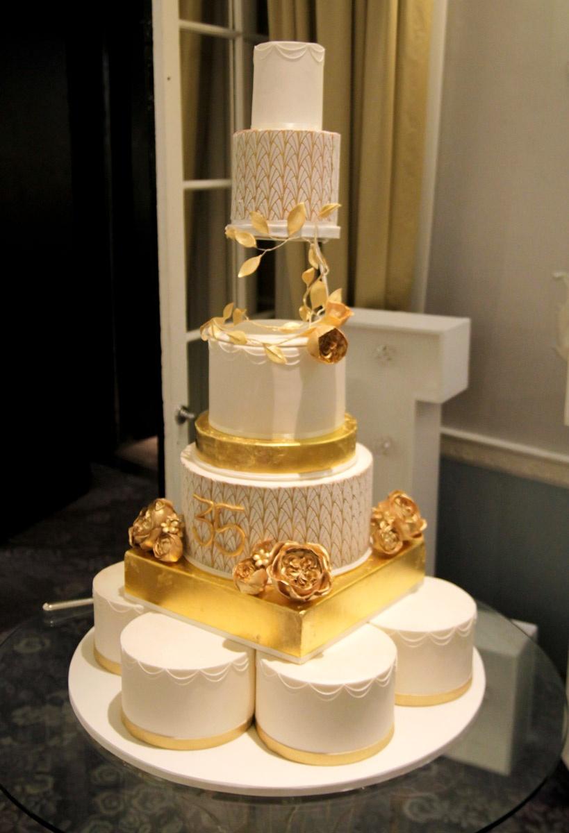 Light ivory, edible gold leaf, ornate pipework and gold sugar flowers and foliage with floating top 2 tiers,