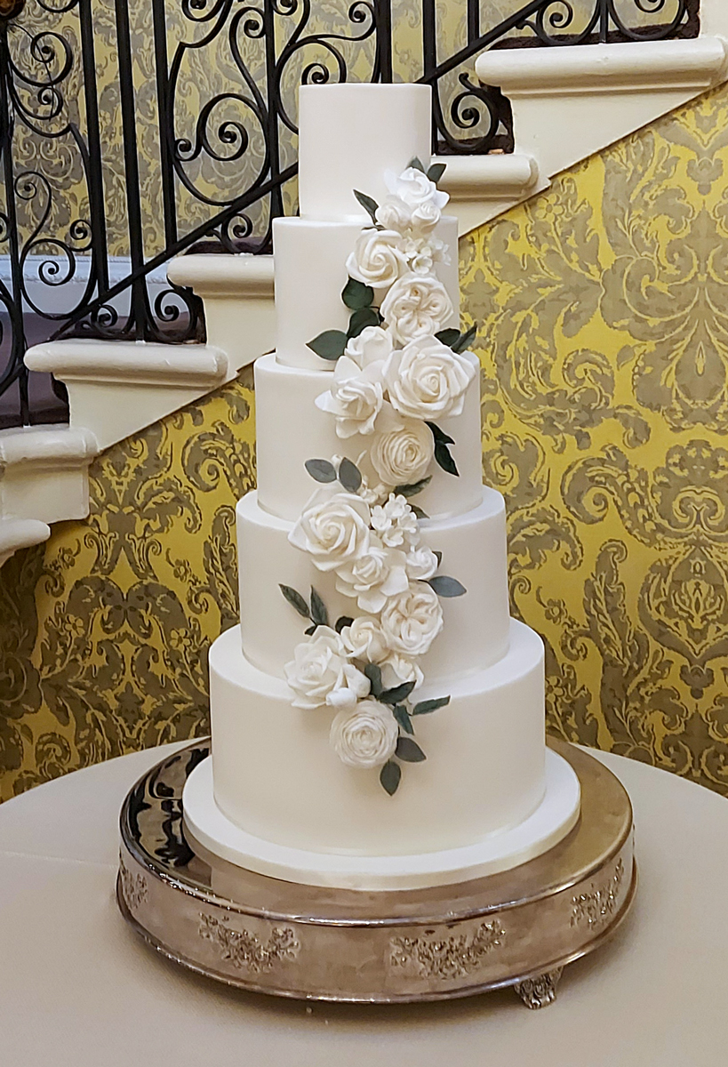 Bridal white fondant, 10mm Double satin bridal white ribbon, sugar flowers and foliage